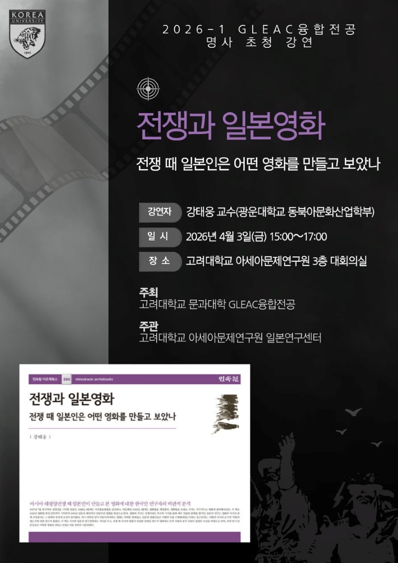 본교 아세아문제연구원에서 개최하는 특강 안내드립니다. [GLEAC융합전공] 명사 초청 강연 강연 제목: 전쟁과 일본영화-전쟁 때 일본인은 어떤 영화를 만들고 보았나 강연자 : 강태웅 교수(광운대학교 동북아문화산업학부) 일시 : 2026년 4월 3일(금) 15:00〜17:00 장소 : 고려대학교 아세아문제연구원 3층 대회의실 주최 : 고려대학교 문과대학 GLEAC융합전공 주관 : 고려대학교 아세아문제연구원 일본연구센터